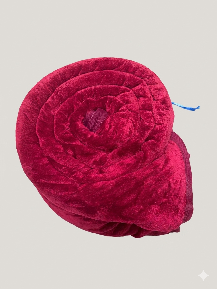 A soft, plush blanket rolled into a compact spiral shape, featuring a rich deep red color and a velvety texture. The fabric appears thick and cozy, designed for warmth and comfort. It’s neatly secured with an attached strap, making it easy to carry or store.